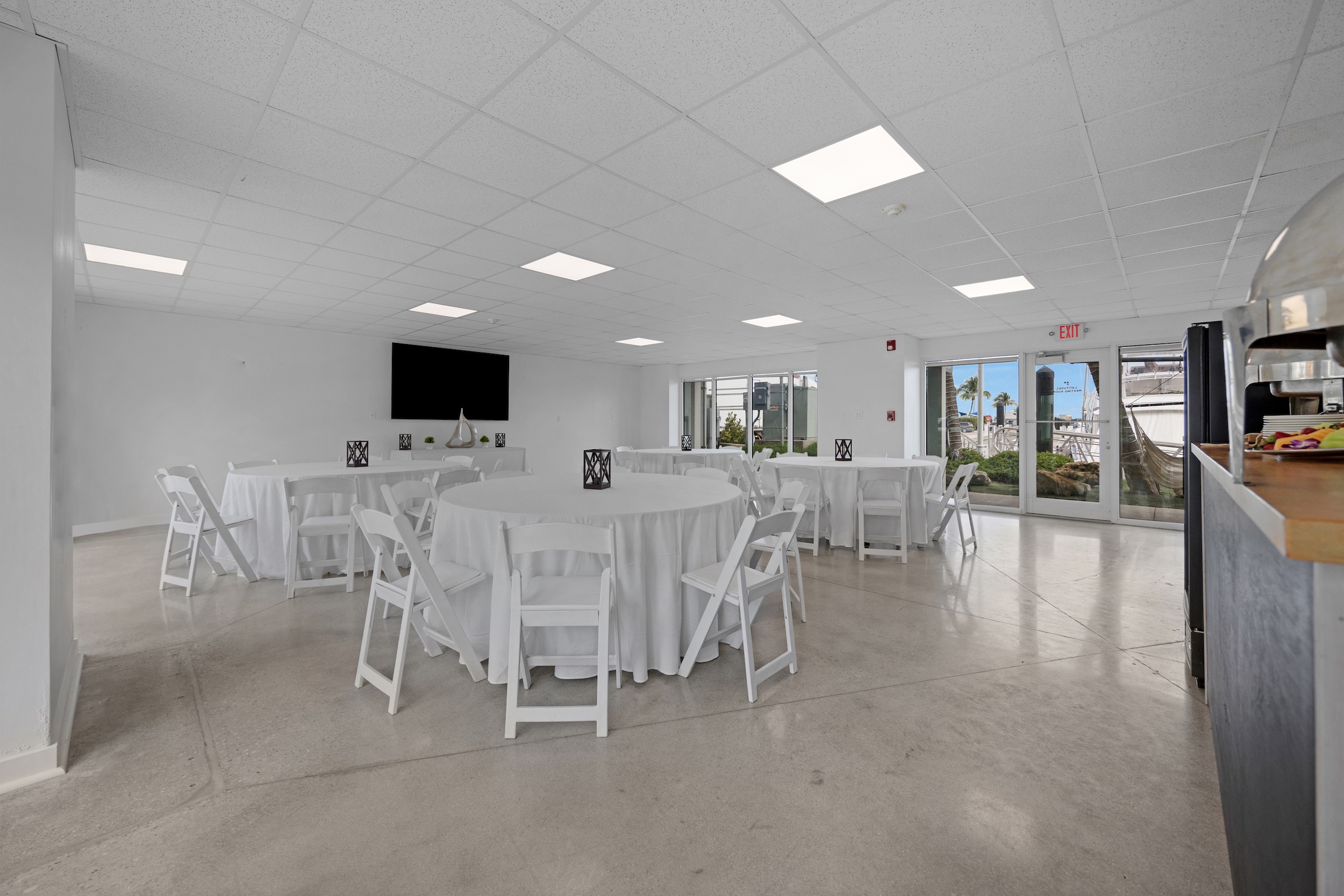 Our largest outdoor space, the Event Lawn, is 3200 sq ft and can accommodate up to 300 standing guests. Matt’s Stock Island can accommodate up to 245 guests and our largest indoor meeting space, the Longitude Room, is 1500 sq ft and can accommodate 100 guests.