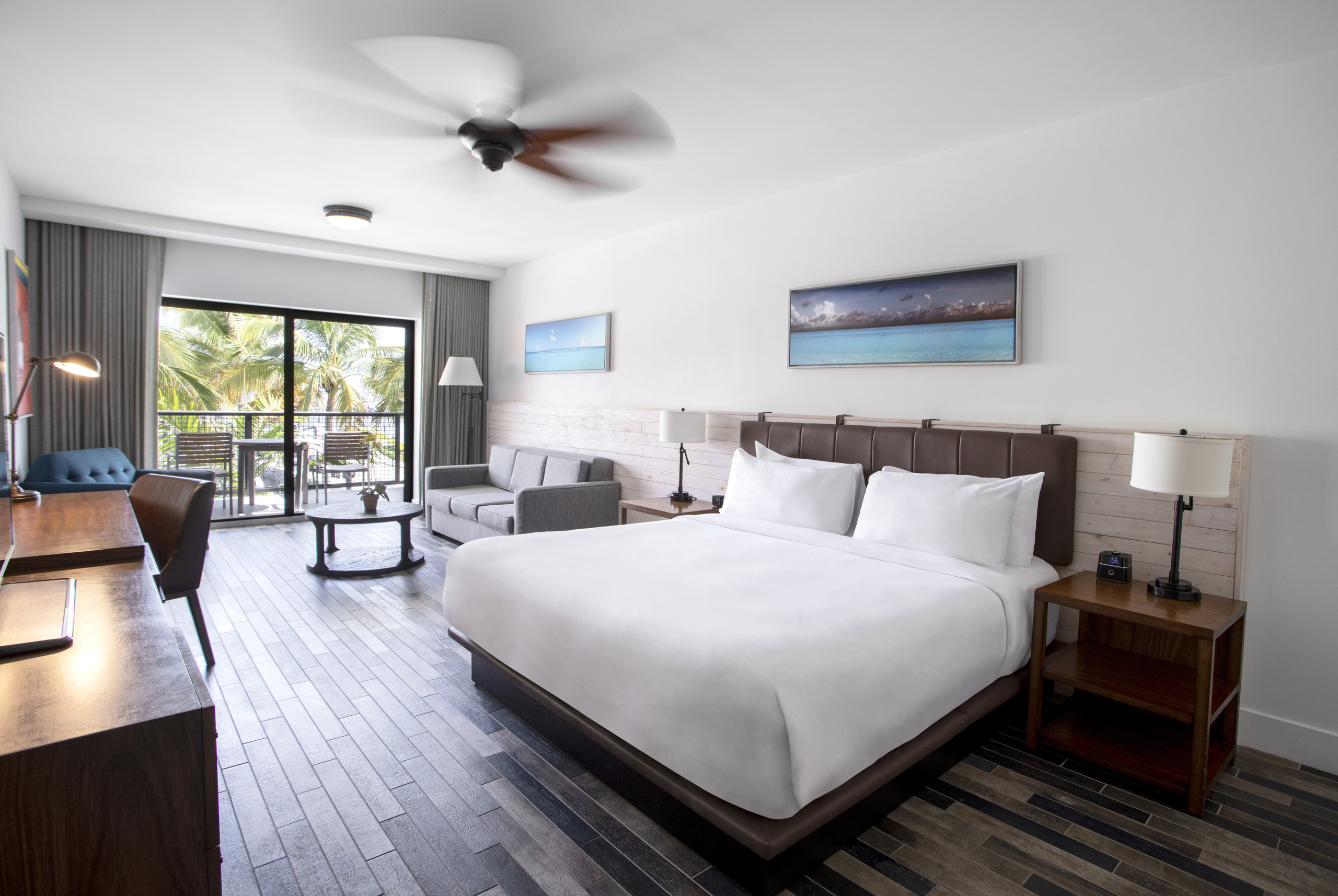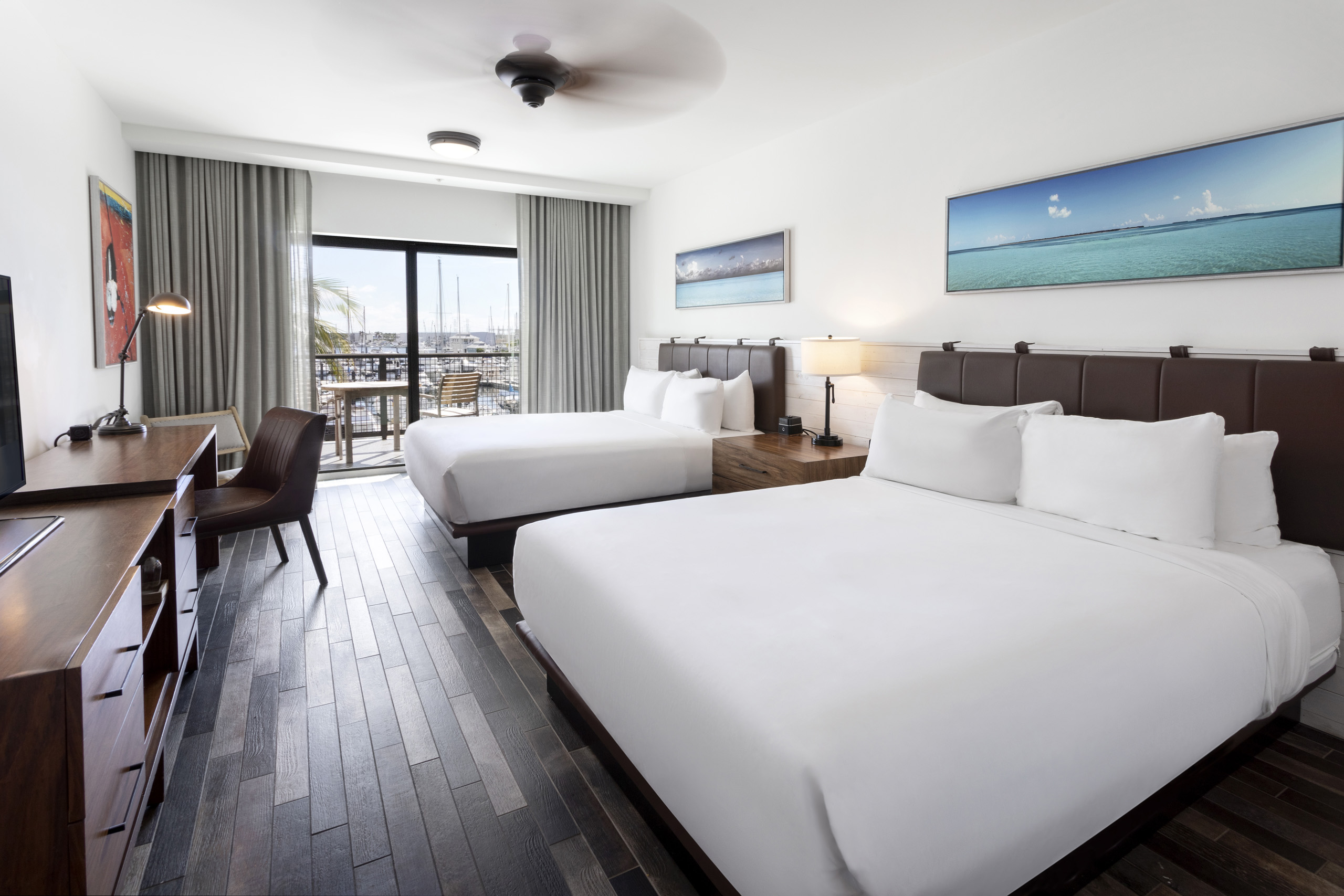 Built for a good time, our Grand Suite features a beautiful 700-sqft terrace complete with dining area and lounge chairs, while the corner bedroom offers plenty of natural light from its full-length windows overlooking both the pool and marina. A spacious living room, wet bar, his-and-hers sinks, walk-in shower and soaking tub round out this suite’s well-appointed amenities. Connecting rooms available as well.